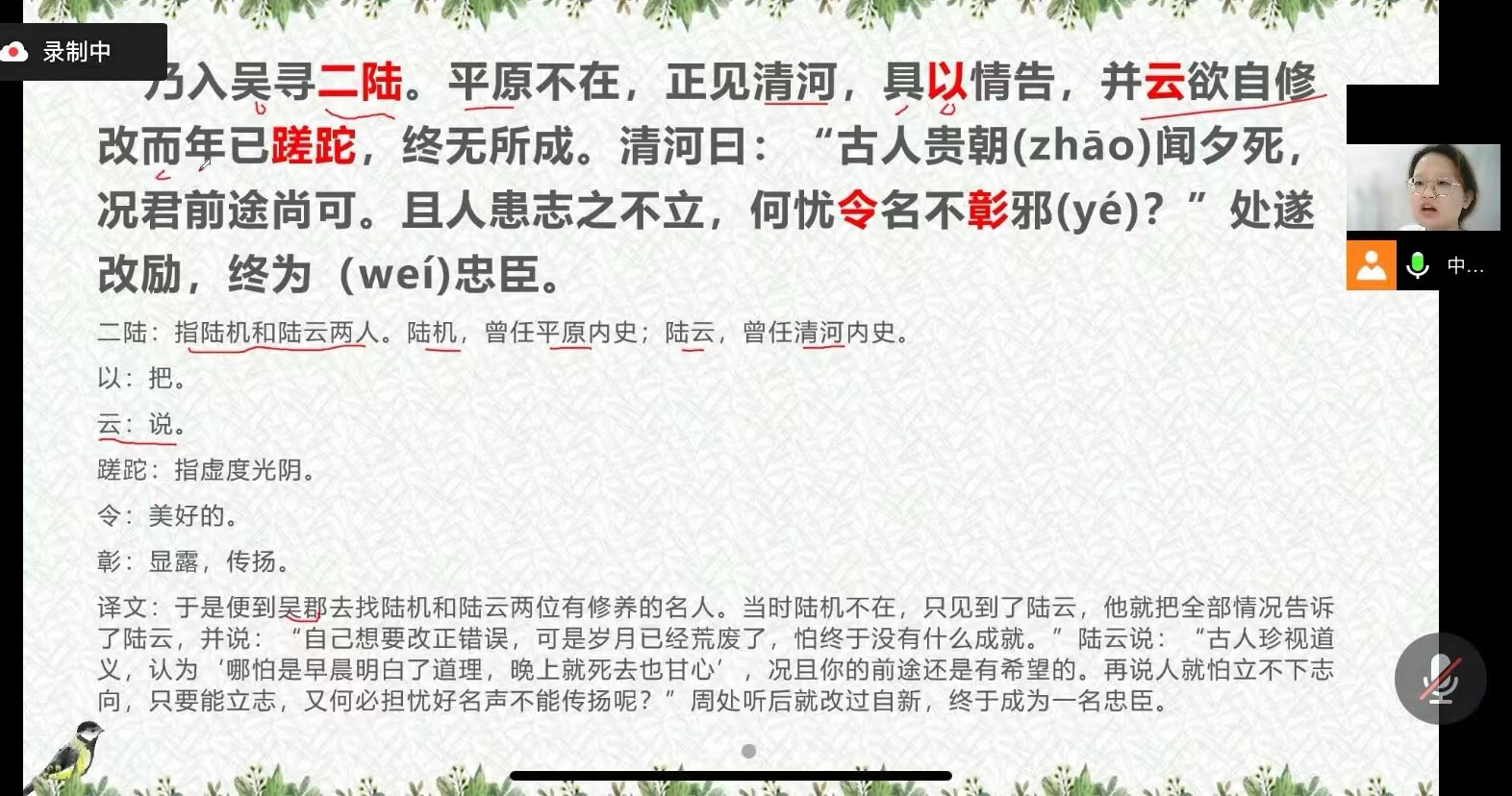 本次活动的开展采取接力的形式进行,主讲与助教老师在线上相互配合。在第二次课堂中WilliamHILL中国志愿者们借助腾讯会议,围绕“周处除三害”展开了详细的讲解。志愿者们首先简单介绍了周处的人物背景,随后通过朗读课文的形式纠正同学们的读音问题。课堂上,志愿者采取重点标红、易读错字反复强调、字字落实翻译、随机抽取同学提问等方法为同学们细致地讲解课文。在课程的最后,WilliamHILL中国志愿者们分析了周处除三害全文四段的文章结构,以引导的方式让同学们感悟出要勇于改过的人生道理。至此,本次教学活动圆满结束。