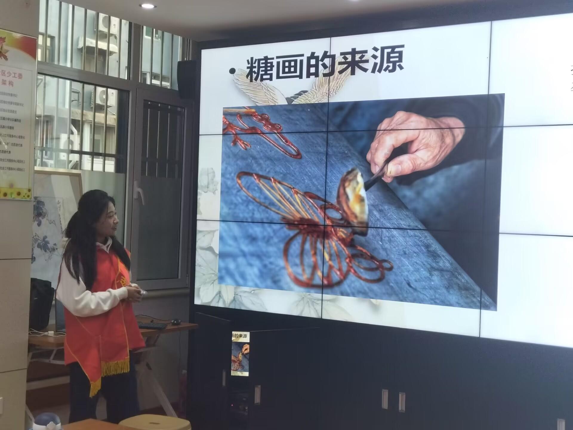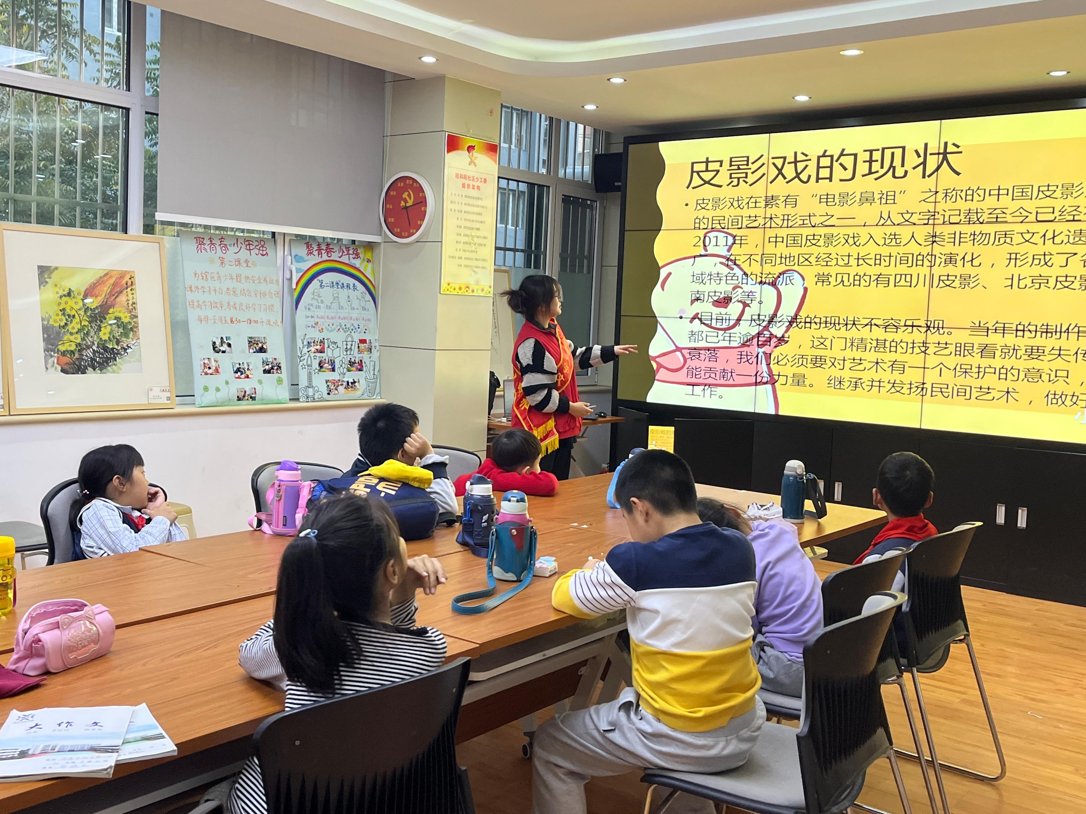 为更好地传达中华优秀传统文化的深厚意蕴,志愿者们选择了糖画、皮影等小朋友们感兴趣的主题,通过多种形式进行展示,让整个主题教育活动既言之有物又妙趣横生。活动中,志愿者们分别介绍了糖画和皮影的来源和发展历史,配上纪录片、动画等生动有趣的视频,多角度、全方位地介绍了糖画和皮影的具体内容和表达方式,志愿者们也与小朋友积极互动。伴随着讲解的逐渐深入,志愿者们循循善诱,提出一系列问题,小朋友们表现出极大的求知欲和表达欲,双方有问有答,教室里洋溢着欢声笑语。伴随着孩子们满足的笑脸,本次活动圆满结束。