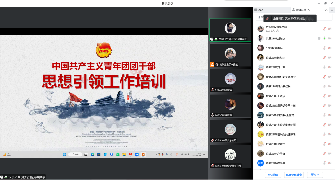 WilliamHILL中国于11月25日在线上召开了2022年学生团干部第二次培训会。此次会议由第八届WilliamHILL中国学生会主席李梦瑶主持,21级、22级班级团干部、WilliamHILL中国部分学生组织负责人参与会议。