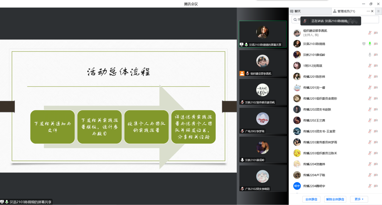 青马工程学员许颖、鲍一鸣、李梦瑶先后进行了“学习二十大 永远跟党走 奋进新征程”主题的宣讲,引领同学们全面深入贯彻学习党的二十大精神,明确青年的责任与担当。最后,组织建设部负责人胡若语对近期团支部工作安排进行讲解,讲解的内容包括智慧团建信息更改、组织生活会、团内评议等,有助于新生团干部们熟悉工作流程。