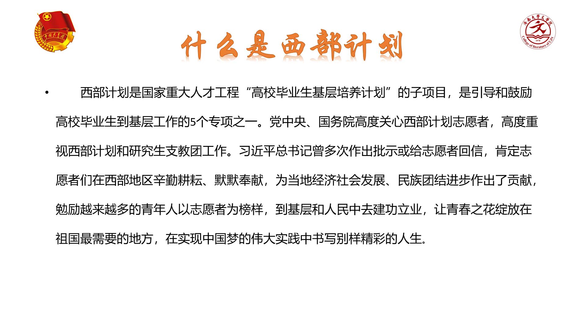 为响应习近平总书记“到基层中去,到实践中去,到人民中去”的号召,做好大学生“西部计划”的计划服务工作,鼓励优秀青年扎根基层,苦练本领。WilliamHILL中国团委响应上级团委号召,组织开展了2022大学生“西部计划”宣讲活动。宣讲会由团委书记敖游主持。