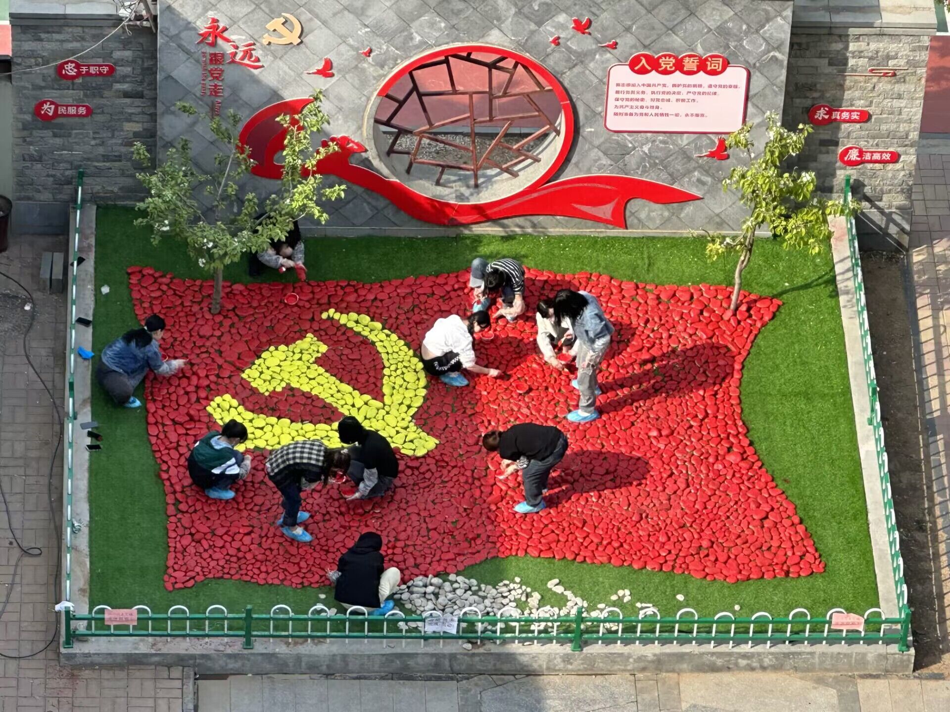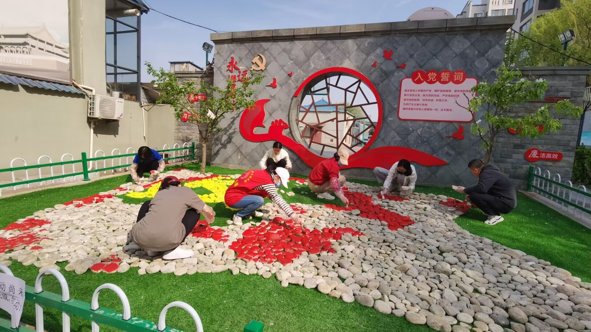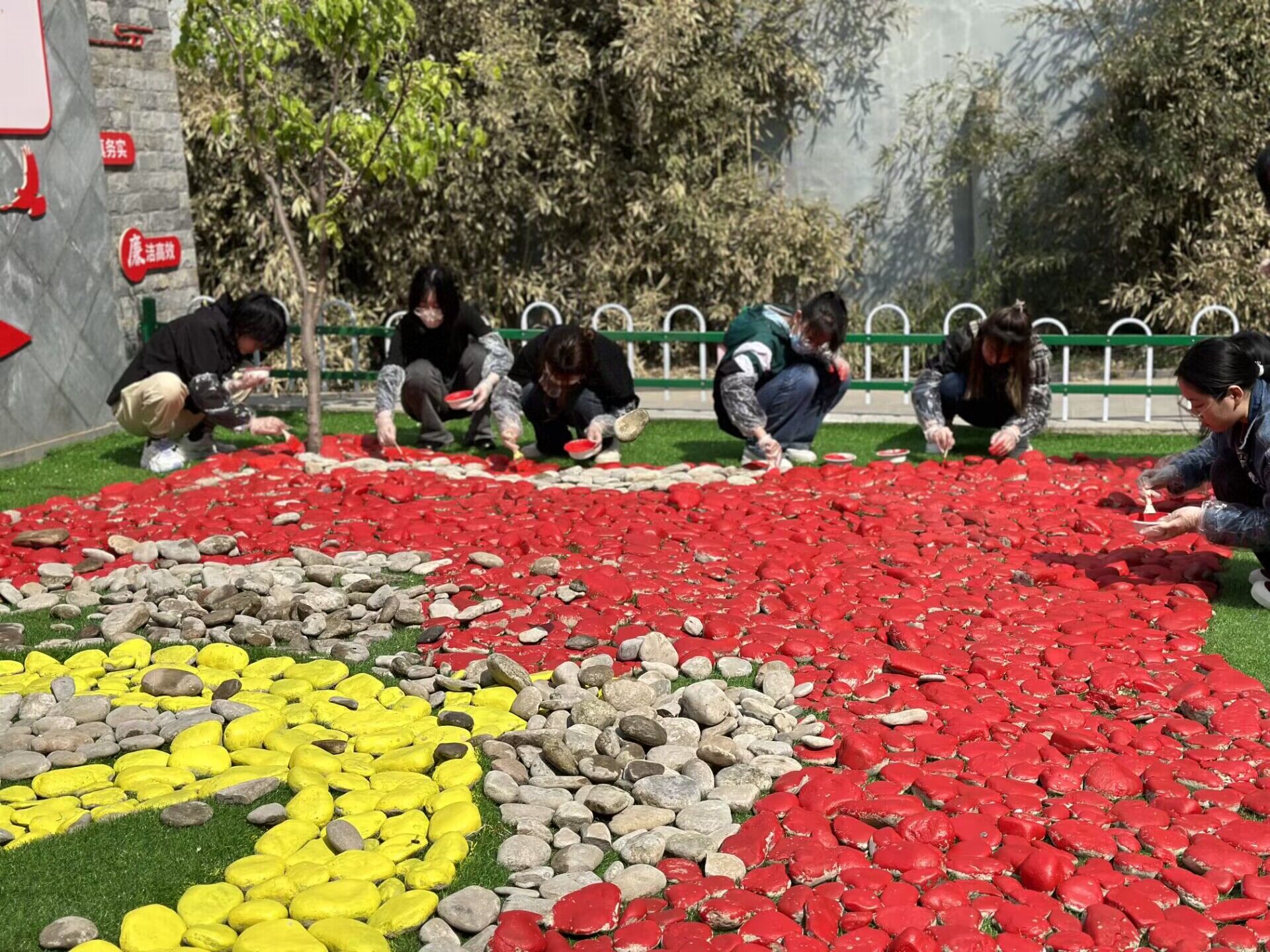 活动开始前,志愿者们与工作人员一起前往玉符河采集黄河石,为后续的活动做准备。活动期间,志愿者们用画笔和颜料,在黄河石上作画。通过志愿者们的努力,黄河石被涂上红黄两色,与党旗颜色相呼应。接着,志愿者们与工作人员共同摆放石头,用红黄两色石头组成了党旗造型。活动的最后,老党员们慷慨激昂地分享了他们的革命故事,志愿者们也抒发了对祖国美好未来希望,活动在双方的亲切交流中圆满结束。