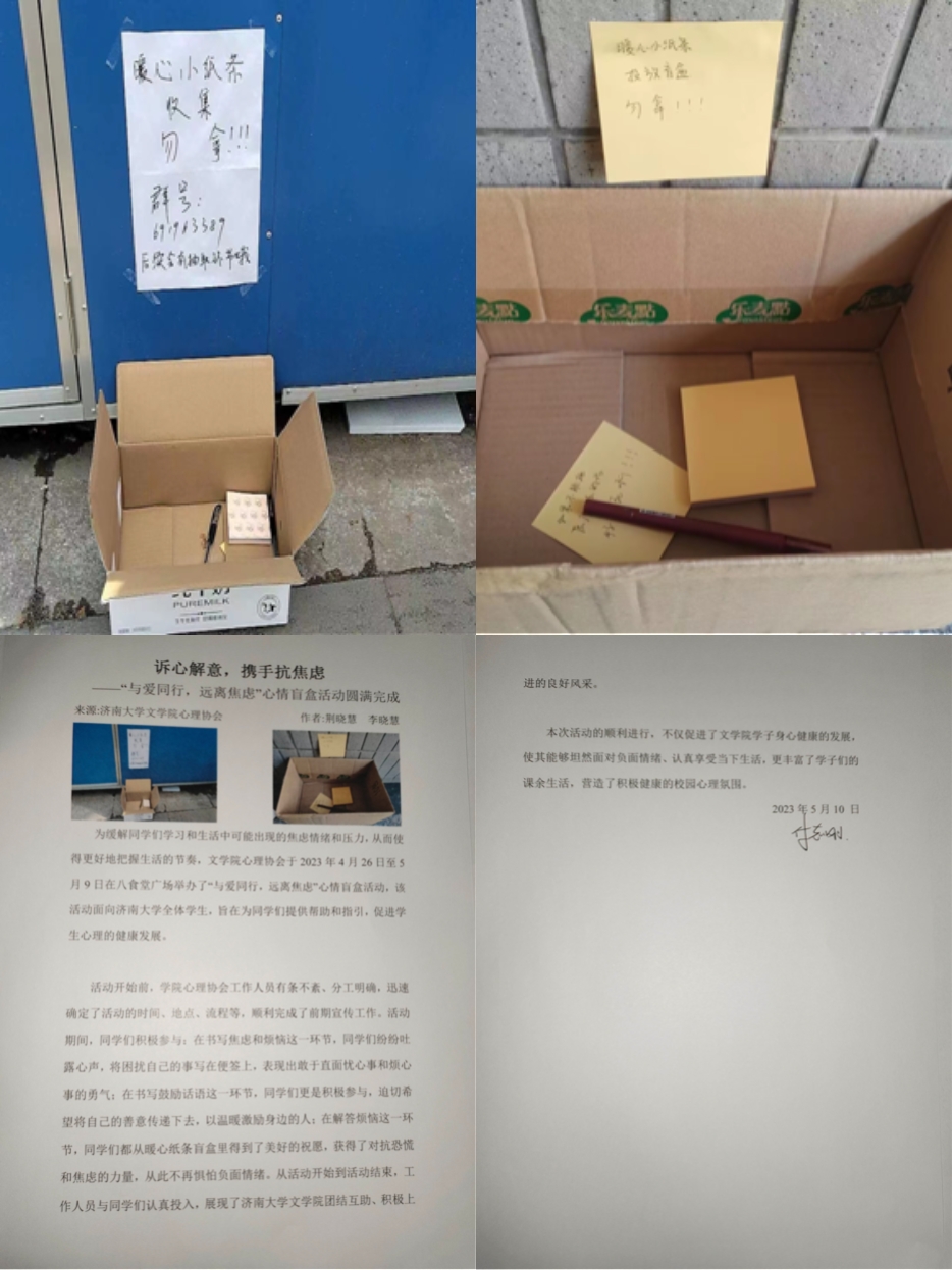 为缓解同学们学习和生活中可能出现的焦虑情绪和压力,从而使得更好地把握生活的节奏,WilliamHILL中国心理协会于2023年4月26日至5月20日在八食堂广场举办了“与爱同行,远离焦虑”心情盲盒活动,该活动面向williamhill全体学生,旨在为同学们提供帮助和指引,促进学生心理的健康发展。