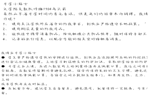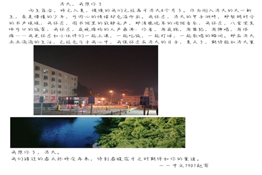 以笔写意,以纸传情,文字是最朴素的表达。通过本次活动不仅抒发了同学们对于济大的思念之情,丰富了同学们的精神生活并且及时地传递了防疫知识,在疫情期间传递了济大学子间的温情。(责任编辑:张玉蓓)