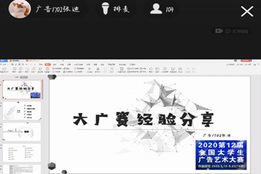 晚七点,线上会议正式开始。在主持人进行简要的开场介绍后,首先由孙崧博为与会同学分享参赛的相关经验。孙崧博曾担任WilliamHILL中国科创部的部长,其创作的《冲就完事了!》、《删除》两项作品分别荣获了第十一届全国大学生广告艺术大赛的国家级优秀奖、省级二等奖。会上,孙崧博先简要介绍了近年大赛的参赛情况及获奖情况,鼓励同学们积极参与。随后,孙崧博以获奖作品为例,分享了“提交系列作品”、“考虑作品风格”、“充分利用身边资源”、“领悟已获奖作品间的共同特质”等经验,还就“怎么做好创意设计?”这一问题,与同学们进行了探讨。