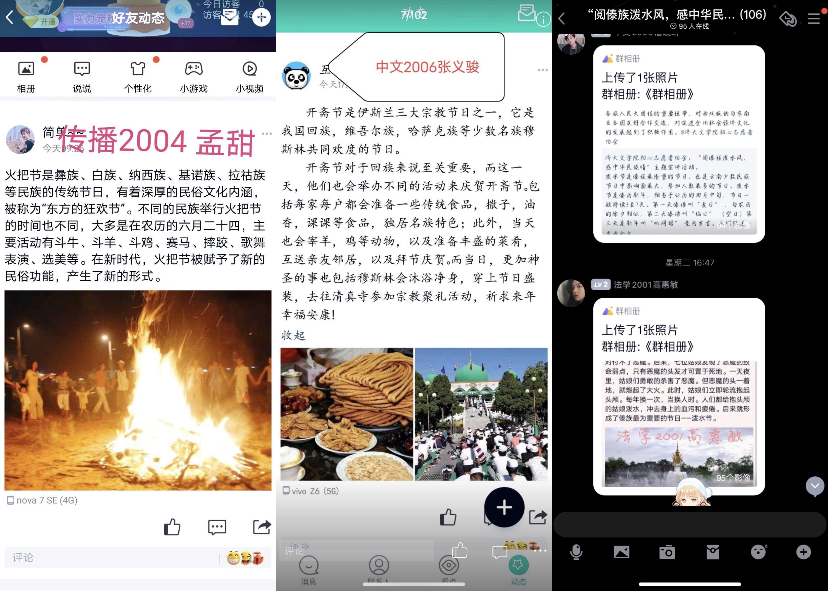 活动筹备期间,志愿者们一起了解“泼水节”文化,就如何开展宣讲活动进行讨论。志愿者通过紧锣密鼓的筹备,做好了材料准备和设备安装等前期工作,商讨并下发活动流程和规则。活动进行当天,同学们积极参与,在四天内,通过线上平台宣传中国特色民族节日,志愿者们陆续在QQ空间等平台发布“泼水节”的宣传文字介绍并配备相关精美图片。志愿者们保持着高度的热情,积极宣讲“泼水节”相关文化知识,并热情地与大家互动,带动了同学们进一步认知中国特色民族节日。