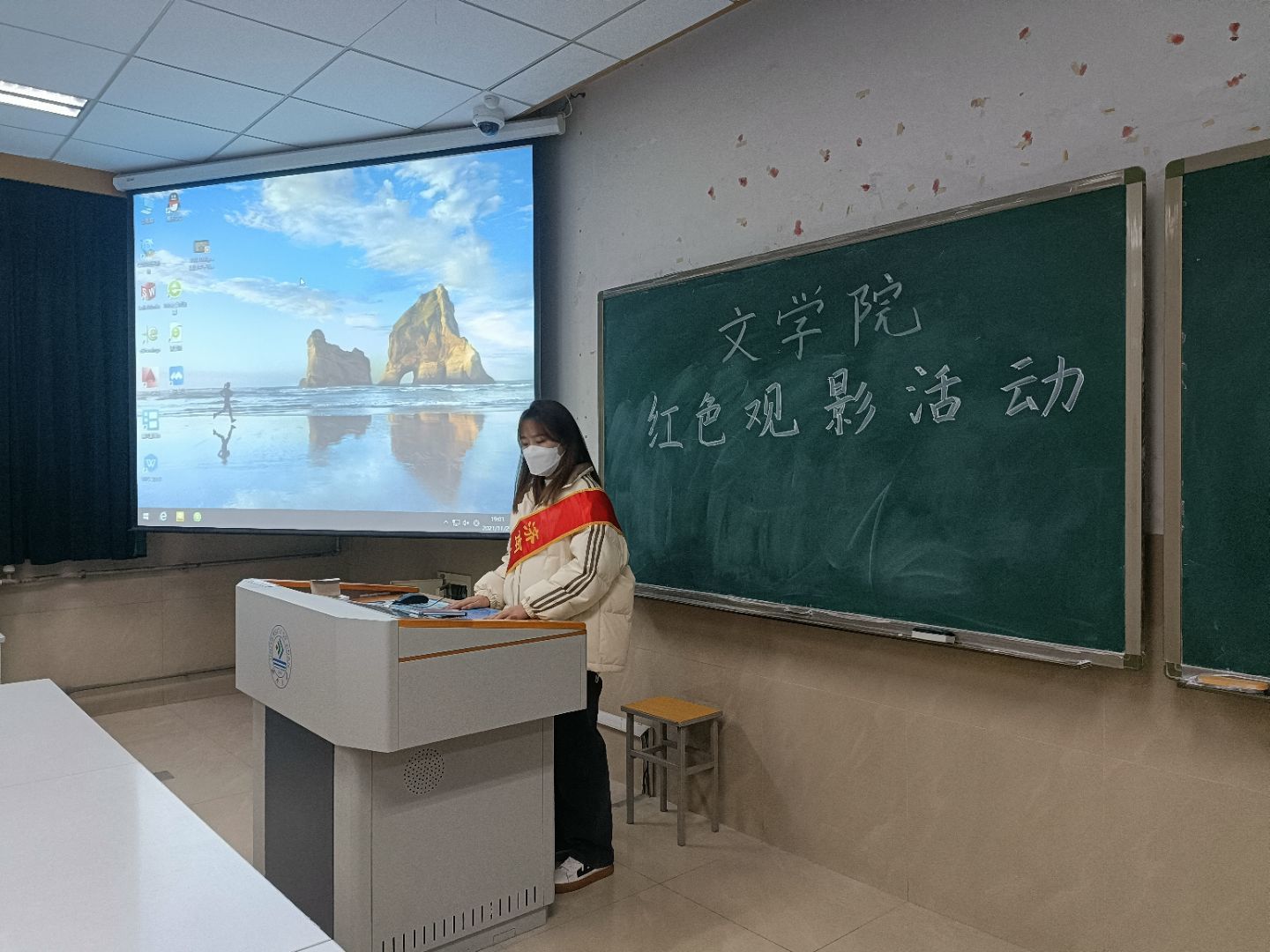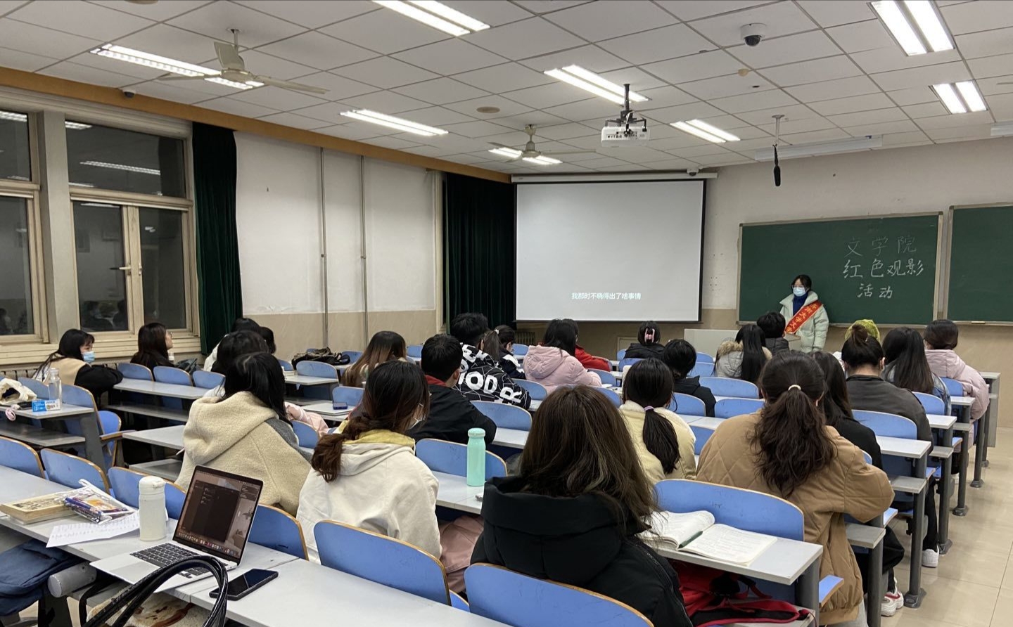 在全体人员有序就座后,观影活动正式开始。影片以淞沪会战为背景,四行仓库保卫战为稿矢,主要讲述了被称作“八百壮士”的中国国民革命军第三战区88师524团的一个加强营,固守苏州河畔的四行仓库、阻击日军的故事。影片《八佰》用鲜明的色彩对比和遒劲的叙事向我们展现出抗日烈士们“魂魄托日月,肝胆映河山”般的动人事迹和“以我之血荐轩辕”的爱国之志。观影期间,由于受到电影氛围的感染,在场同学一直保持着庄重肃穆的状态。影片结束后,同学们纷纷表示,正如鲁迅先生所言:“有一分热,发一分光,就令萤火一般,也可以在黑暗里发一点光,不必等候炬火。此后如竟没有炬火,我便是唯一的光”,面对山河破碎的家园,爱国志士们以个人之萤火,耀国家之星河,他们用血肉铸就华夏的钢铁长城,这种精神值得每一位中华儿女去学习和弘扬。