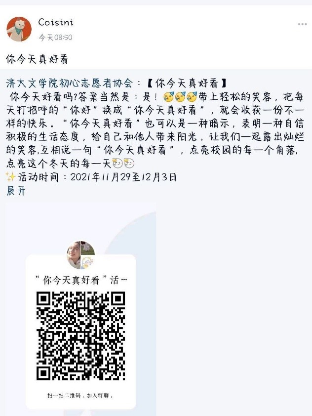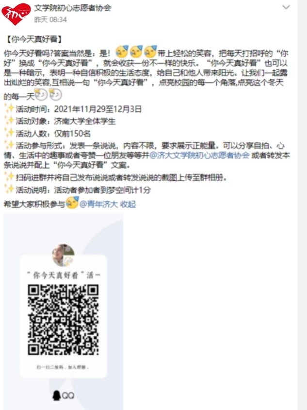 活动开始之前,敬老队组织召开了例会,确定了活动人员、具体活动时间和地点及活动方式,为此次活动做了充足的准备。活动当日,济大WilliamHILL中国初心志愿者协会官方账号进行活动宣传,并引导学生通过转发官方账号说说并配上“你今天真好看”的文案或分享自拍、心情、生活中的趣事,再或者夸赞一位好友等。活动要求参与此活动的同学需要将自己发表的说说截图并上传至群文件。此次活动安排合理,组织有序,进行得如火如荼,同学们踊跃参与并且分享了自身的许多趣事,将快乐和温暖传递至校园的各个角落。活动结束后,由志愿者协会的工作人员进行后期审查并且为参与者进行到梦空间加分,同时复盘了本次活动,总结了活动经验并指出了亮点和不足,为下一次活动的顺利开展积累了经验。