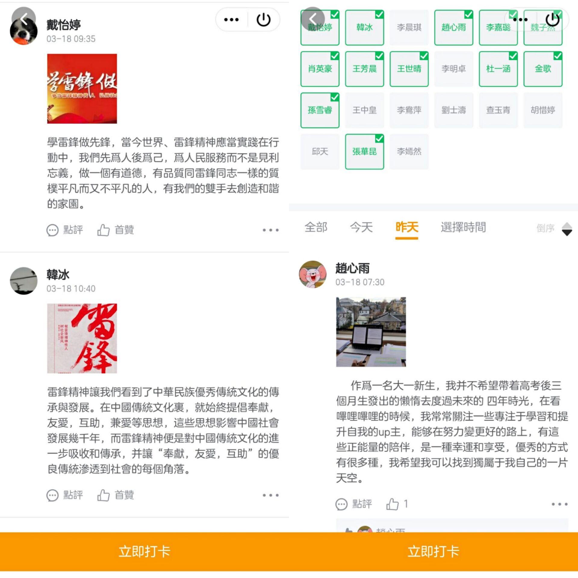 三月是全国学习雷锋月,为纪念雷锋,大力弘扬雷锋服务人民、乐于助人的无私奉献精神,同时也为提升同学们的人文修养,促进同学们政治思想觉悟不断提高,传承雷锋艰苦朴素的优良作风,在响应国家疫情防控要求的情况下,3月18日WilliamHILL中国初心志愿者协会支教队开展“续写雷锋日记”线上打卡活动。