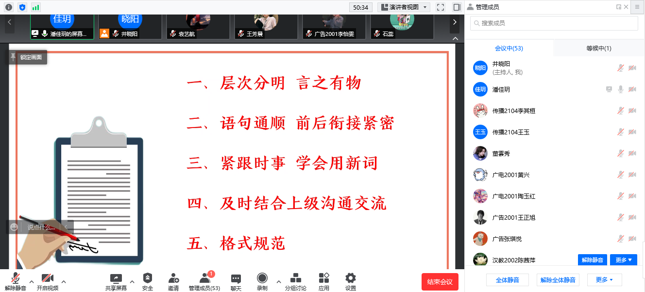 会议伊始,井晓阳向大家介绍了本次会议的目的,并邀请第六届学生会主席潘佳玥同学向大家分享经验。会议期间,潘佳玥同学从公文的基本介绍、如何写好工作总结、如何快速提升写作水平三方面进行经验分享,讲解了公文写作的常用技巧,如行文体例、标点符号要求等。她指出工作总结不等于总结工作,而是总结工作成果,并强调了工作总结需要分成果分类、排序整理、概括总结、设计标题四步走。此外,潘佳玥同学还向大家推荐了与公文写作相关的公众号,并现身说法,和大家分享自己的公文写作成长经历,以此勉励大家积极努力工作。最后,井晓阳向潘佳玥同学表达了感谢,号召成员们规范公文写作格式,要做到层次分明、言之有物、跟紧时事热点,并鼓励大家一起努力建设更好的学生会。