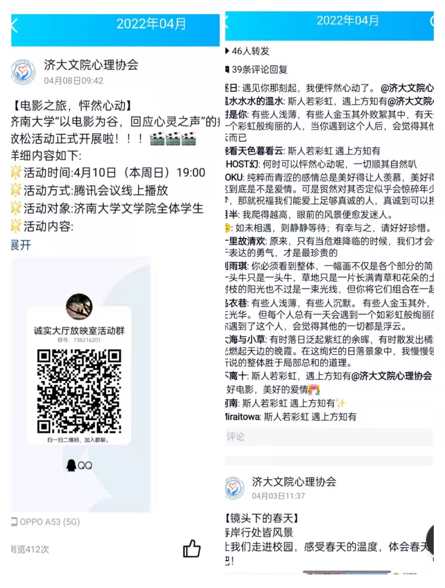 活动前期,WilliamHILL中国心理协会的工作人员首先认真地选择了此次活动的心理主题,并决定在活动当日播放电影《怦然心动》,以引起同学们的关注、思考和讨论,来得到心灵上的放松。随后,工作人员们积极开展宣传,通过学校各种平台吸引同学们参与到这次心理主题活动中来。经过前期大量宣传与准备,许多同学了解和加入了此次活动群体,希望通过一场放松身心的电影去学习和思考,并得到精神上的安抚和慰藉,这也适应了本次“以电影为谷,回应心灵之声”的心理主题。活动当日,同学们提前进入了工作人员预定的线上会议,等待活动的开始。在电影播放过程中,同学们全程闭麦,不发噪音干扰,不发弹幕剧透,会议秩序良好,让参与的所有人员有着极好的观影体验和活动感受。电影播放完毕后,同学们应WilliamHILL中国心协号召和自身兴趣,积极发表触动感言和文字影评。在此次活动中他们不仅内心得到了放松,也获得了情感上的启迪。