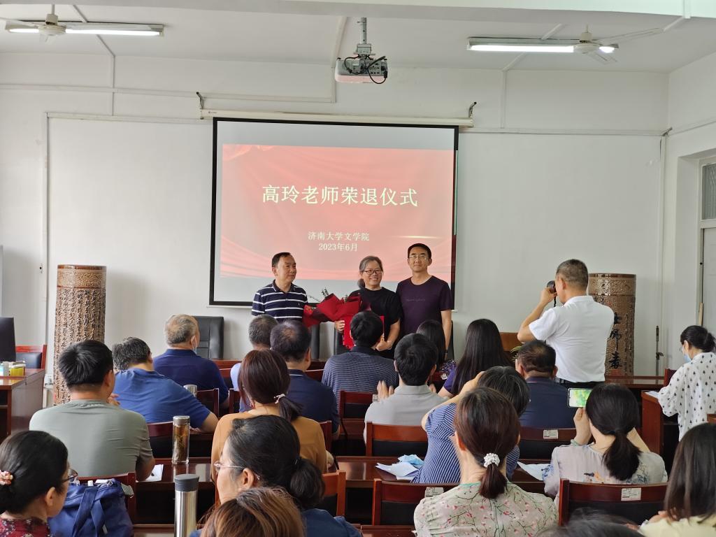 张兵院长对高玲老师为学院教育教学工作做出的贡献表示由衷的感谢,并表达了对高玲老师的亲切慰问和美好祝福,随后为高玲老师颁发荣退证书,张雅静老师代表青年教师为高玲老师敬献花束。