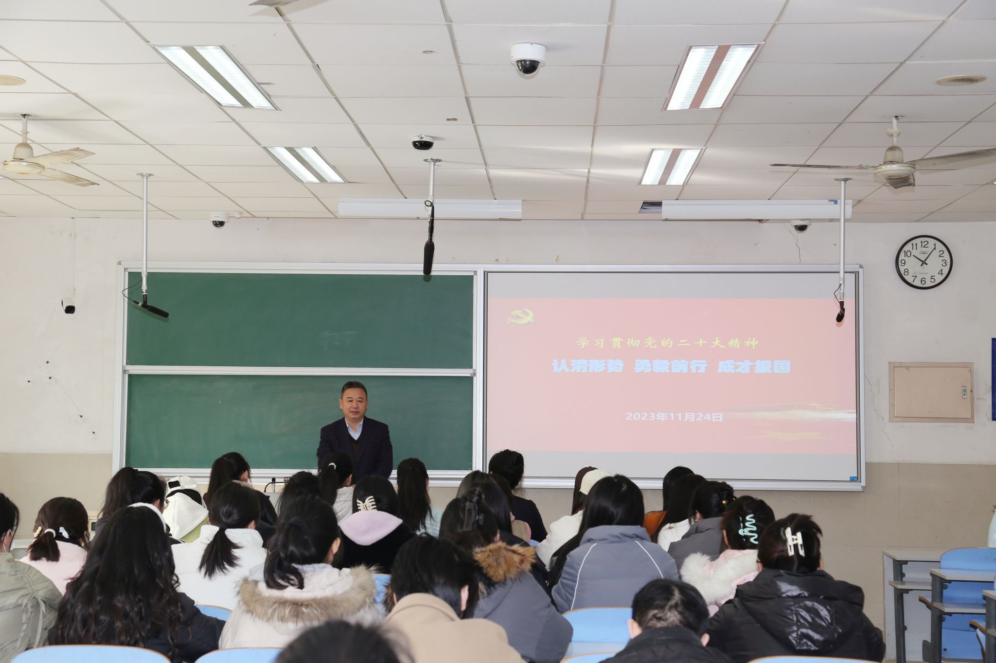 查玉喜主要从三个部分讲述,促进学生学党史、懂国情、悟理论。第一部分,查玉喜就党的二十大主要精神展开介绍,结合自身工作生活实际和学生学习实际,拓广度、延深度、聚精度、显温度 ,引领广大青年学子在了解二十大总体情况的基础上深刻领悟会议精神。第二部分,查玉喜介绍了目前国际及周边形势,要求同学们要全面认识目前形势,增强使命感紧迫感,提升认知 ,全方位、 多层次地了解世界、融入世界、拥抱世界,深刻理解“人类命运共同体” 的科学内涵和价值意蕴。第三部分,查玉喜谈到青年大学生的责任与使命 ,他强调新时代青年要有一种“使命光荣、重任在肩、时不我待”的信仰与担当。最后,他对同学们提出四点殷切期望:第一,切实增强危机意识与责任意识,机遇与挑战并存,青年人更要以青春之活力不断开拓创新,担起时代使命;第二,树牢“四个意识”、坚持“四个自信”、做到“两个维护”,做科学理论的忠实信仰者、宣传者、践行者;第三,勤奋努力、执着奋进,不断提高素质能力,青年人应起而行之、真抓实干、常抓不懈;第四,共同维护安全稳定,加强政治安全、消防安全、网络安全和个人安全。