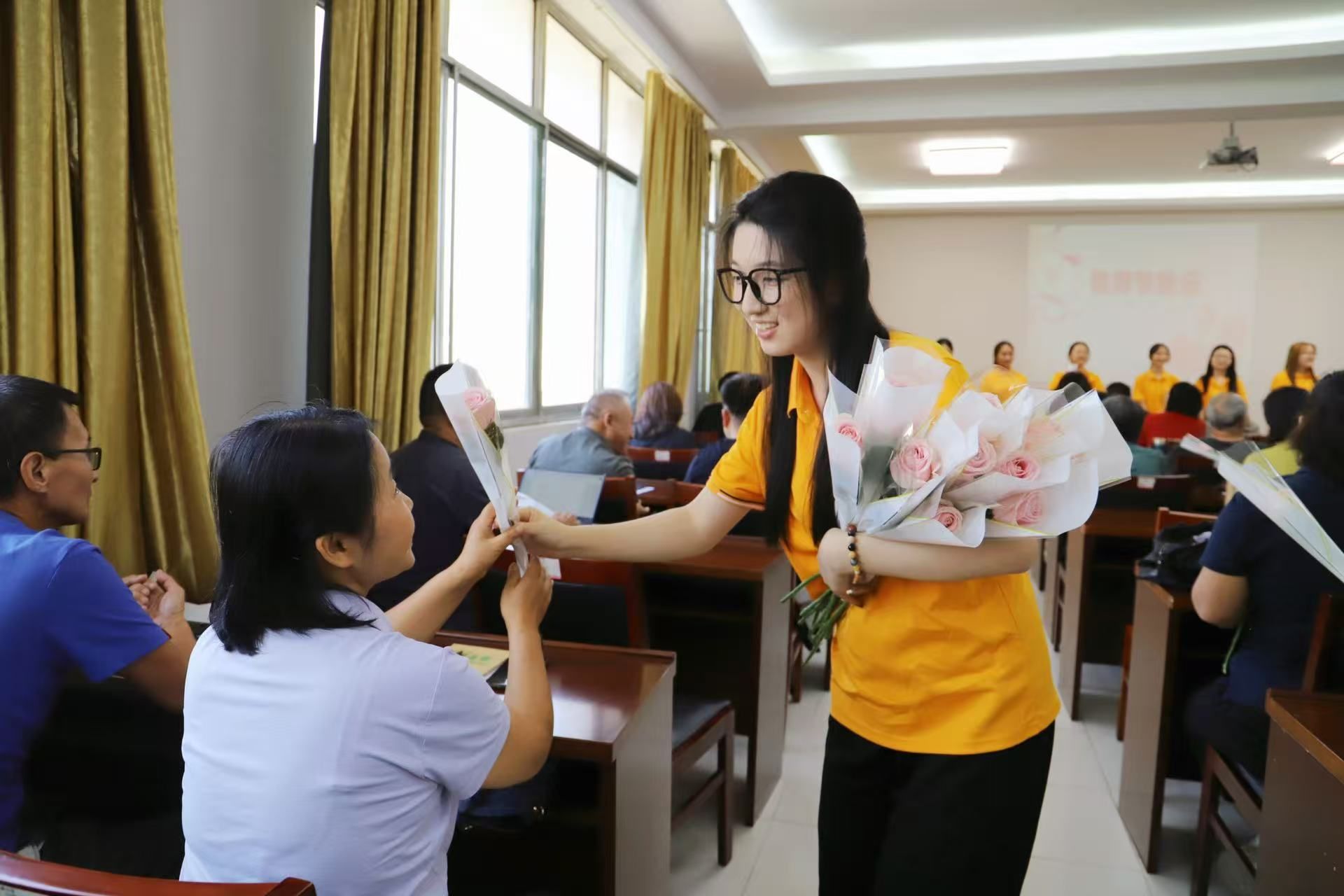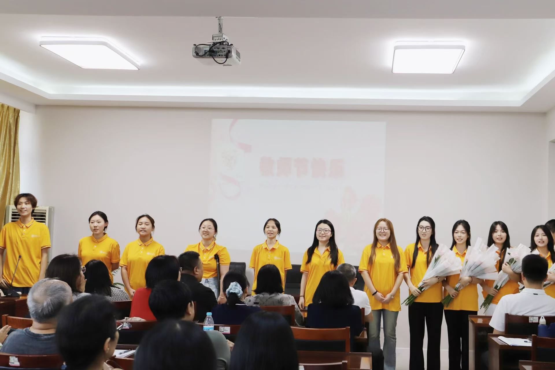 会后,学生代表以歌声传情、鲜花致敬,为全体教职工送上了温馨的教师节祝福。"长路奉献给远方,玫瑰奉献给爱情......"随着经典歌曲《奉献》的悠扬旋律响起,全场教师为之动容,纷纷用手机记录下这感人瞬间。他们用青春旋律定格温暖瞬间,用双向奔赴诠释师生情谊。学院为每位教师准备了鲜花,教师们手捧鲜花,脸上洋溢着笑容,师生之间的情谊在这份花香中愈加深厚。一朵朵鲜花表达了学院对推动学院各项事业高质量发展的教师的感谢,也传递了桃李天下、英才辈出的美好育人愿景。