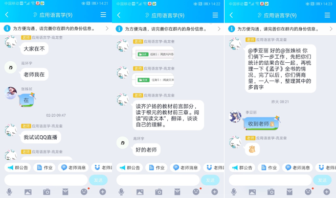 高龙奎老师在开课前两周便不断学习、调试各种直播平台。分别调试了:QQ群视频、QQ群课堂、雨课堂、学习通、研课堂、腾讯课堂、腾讯会议等各种直播平台,并与语言学专业老师交流经验。鉴于雨课堂、学习通等平台经常掉线,同时考虑上课需要大量互动等实际问题,最终确定采取QQ群视频直播授课,并在QQ群提前布置课前预习。