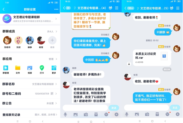 课后,刘艳芬老师还利用QQ群给学生发布扩展资料,及时为学生解疑答惑。学生在调查问卷中写到:“刘艳芬老师的《文艺理论专题》非常精彩,讲课具体生动,有逻辑性和启发性,让我改变很多以前的想法。”“刘艳芬老师在课后及时回复我们提出的问题,QQ群成了我们的第二课堂。”