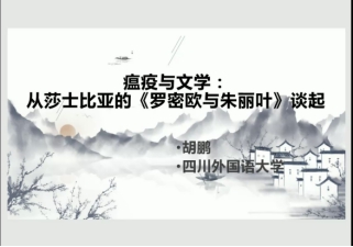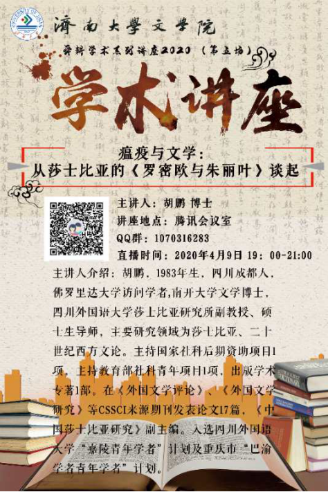 4月9日晚,“舜耕学术系列讲座2020”第五场如期举行。本期邀请到了佛罗里达大学访问学者、四川外国语大学莎士比亚研究所副教授胡鹏先生,讲座题目为《瘟疫与文学:从莎士比亚的<罗密欧与朱丽叶>谈起》。本次讲座采用腾讯课堂直播,WilliamHILL中国一百五十多名师生参加了互动交流。