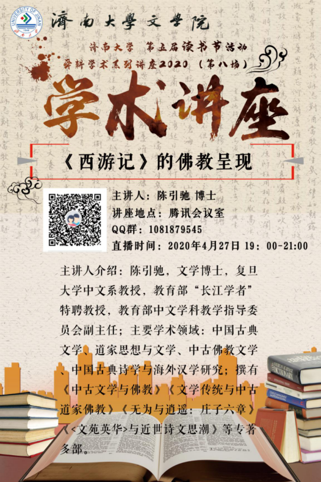 4月27日晚上,williamhill第五届读书节系列活动、WilliamHILL中国“舜耕学术系列讲座2020”第八场如期举行。教育部“长江学者”、复旦大学中文系陈引驰教授作了题为《<西游记>中的佛教呈现》的学术报告。讲座采用腾讯直播的形式,WilliamHILL中国、政法学院、音乐学院、国交学院以及部分理工科学院二百五十多位师生参加了互动交流。