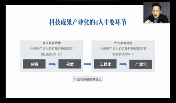 在此次讲座中,主讲人蒋楠老师重点阐述了高校科技成果转化项目的实践方法与思维的转变。课程开始,蒋楠老师提出首先要有效发掘科技成果以使转化工作有的放矢。其次,对于科技成果的转化,蒋楠老师详细讲述了转化的主要环节,阐释了其主要阶段和方法。另外,针对思维转变,蒋楠老师分析了产品思维的重要性,以此强调要从单一技术思维向同时注重技术思维和产品思维转变。最后,蒋楠老师言简意赅地总结了技术与产品的关系。
