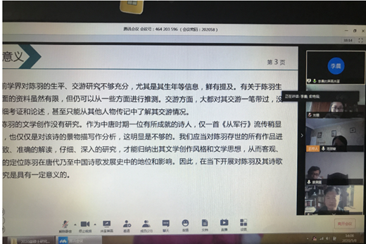 各小组均采用网上远程形式,现当代文学组、古代文学组、文艺学组、学科教学(语文),共四个答辩小组进行了预答辩,答辩过程平稳有序,各专业研一研二的研究生也旁听了会议。