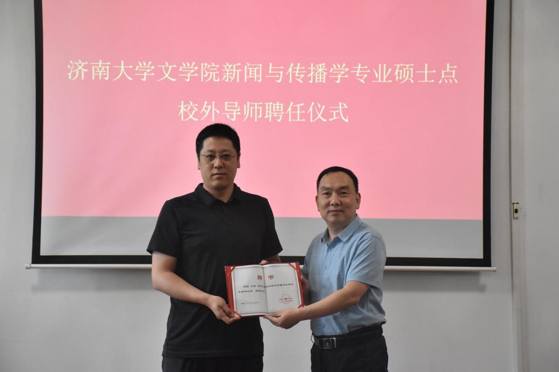 接着,张兵院长从学科专业背景、生源质量、师资水平、教学资源等方面介绍了学院的基本情况和合作基础。张院长指出,传播学类专业属于应用型专业,重在实践教学与学生动手能力的培养,目前亟需行业、企业等社会力量的参与和支持;济南平鼎广告传媒有限公司在广告、新媒体运营等方面成绩斐然,与我院在新闻与传播学本硕人才培养、师资队伍建设、项目协同攻关等领域有较大合作空间,希望实现互利共赢。与会人员积极发言,就双方的合作展开了深入、细致的讨论,在实习基地建设、实验室建设、实践指导、微专业建设等多个方面达成初步共识。最后,张兵院长为吕铮董事长颁发了专业硕士校外导师聘书,正式聘其为我院新闻与传播学专业硕士生导师。