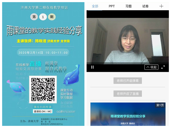 另一方面,学院积极组织教师参加学校开设的网络授课培训,掌握williamhill网络教学平台、雨课堂等智慧教学软件的使用与操作方法。其中我院教师陈晓洁受学校教师发展中心的邀请,为全校教师作了雨课堂的教学实践经验分享的辅导。