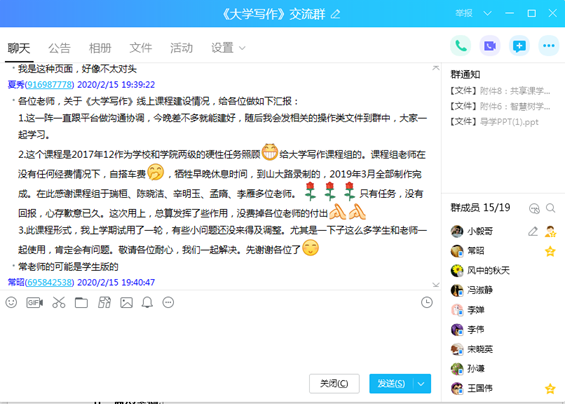为保证教学效果,学院规定授课教师可根据课程性质以及个人习惯等,灵活选用雨课堂、课程派、学习通、QQ群、QQ直播、腾讯视频等各种授课软件或课程平台。同时,要求每位教师至少要准备两种授课预案,以应对随时可能出现的网络拥堵情况。除了选择适宜的教学手段,学院教师在准备线上教学的过程中,对课程性质、内容、授课对象、学情等作了认真分析,并作了相应调整。如《大学写作》作为公共课程,面临着授课对象、授课教师众多等问题,因前期课程负责人夏秀教授及其团队在“智慧树”建设有完整的网络视频课程,已试运行一个学期,并且成功申报2019年省级课程教学平台建设项目,可以说线上资源相对完善成熟,故本学期面向全校的《大学写作》课程全部采用网络在线课程授课,这样既能够适应当前非常时期的教学需求,同时又能够统一该课程的教学内容、教学任务、及评价指标等。在准备网上授课之前,学院特组织建设有“《大学写作》授课交流QQ群”,由课程负责人夏秀教授对所有《大学写作》授课教师进行培训、辅导,及时沟通“智慧树”平台负责人,解决遇到的各种技术问题等。