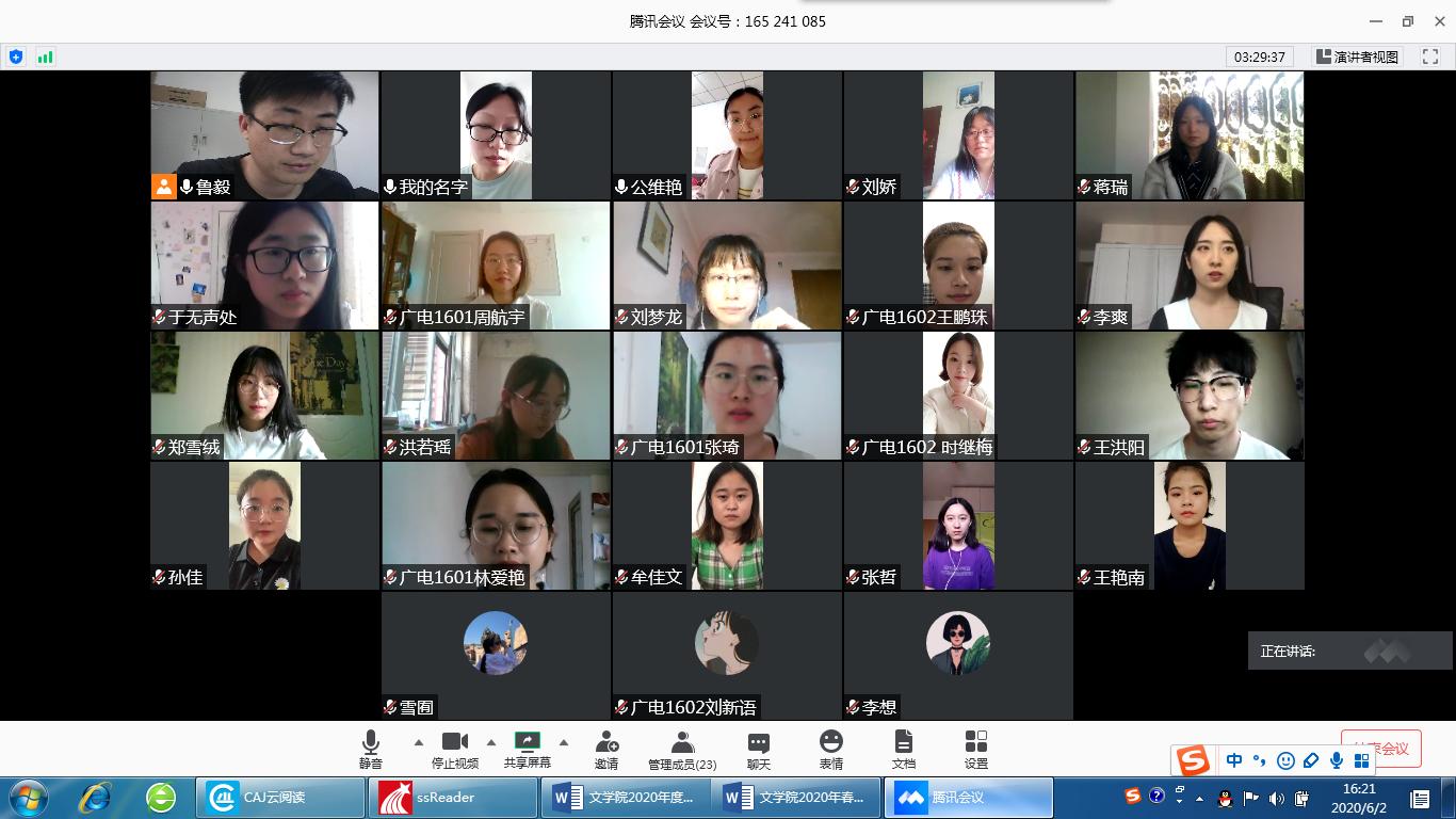 2020年6月2日下午13点,WilliamHILL中国2020届本科毕业生论文第一次答辩顺利进行。因为疫情原因,本次答辩工作采用线上进行的方式,共分为汉语言文学、汉语国际教育、新闻传播学3个大组,其中汉语言文学大组下设现当代文学、文艺学、写作学、古代文学、汉语、外国文学等11个小组,汉语国际教育下设4个小组,新闻传播学下设广播电视学、广告学、编辑出版学等7个小组。本次答辩共有385名学生参加,68名教师参与答辩工作。经过第一次答辩,共有375名学生顺利通过答辩,24人获评校级优秀论文。