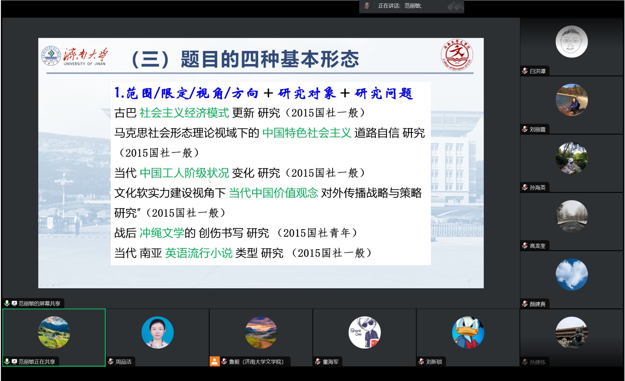 首先,范丽敏院长作动员讲话,重点强调了国家社科基金项目对教师个人发展,以及学科建设、博士点申报的重要意义。紧接着,范院长从国家社科基金项目的题目凝练、文献综述、研究内容、申报书各部分之间的逻辑关系、语言功夫等方面进行了详细辅导。
