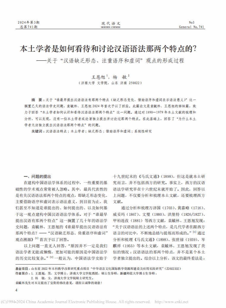 我院王恩旭副教授与硕士研究生杨敏所撰写的论文《本土学者是如何看待和讨论汉语语法那两个特点的?——关于“汉语缺乏形态、注重语序和虚词”观点的形成过程》于《现代语文》2024年第3期发表。论文为山东省 2022 年本科教学改革研究重点项目“中华语言文化国际教学资源库建设及应用实践研究”(Z2022332)的阶段性成果。