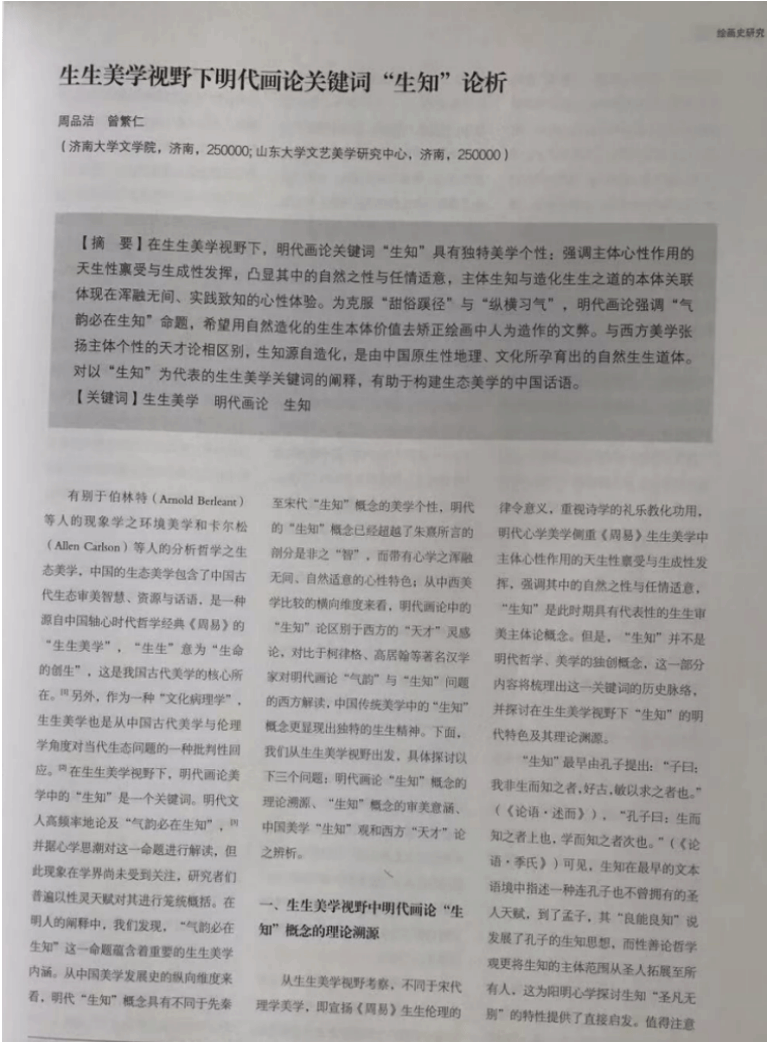 我院周品洁博士的论文《生生美学视野下明代画论关键词“生知”论析》于《中国美术研究》(CSSCI集刊)2024年第1期(总第49辑)发表。