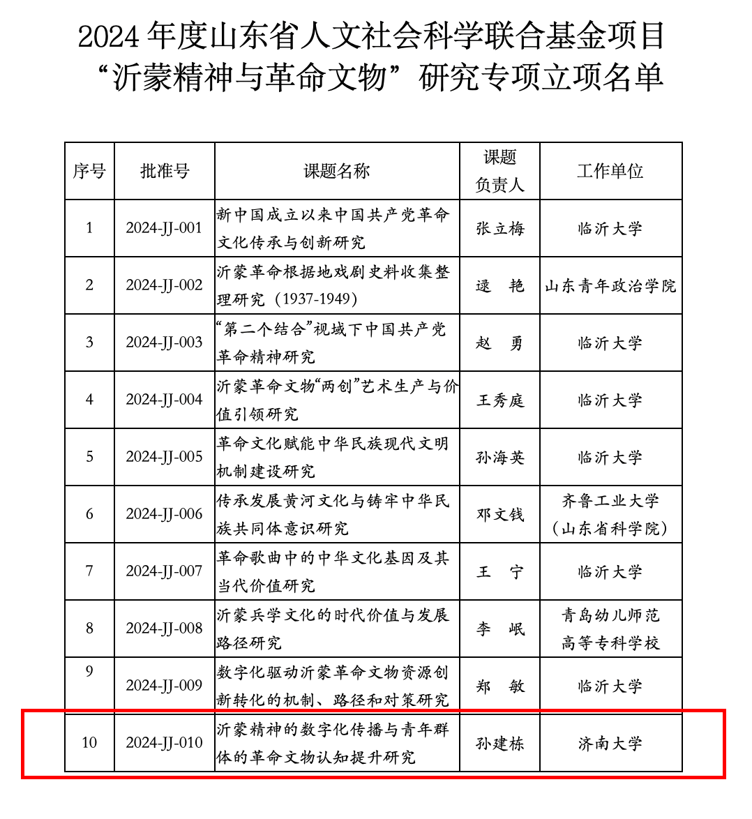 近日,根据《山东省人文社会科学联合基金项目管理办法》,山东省人文社会科学联合基金项目2024年度沂蒙精神与革命文物研究专项经组织申报、资格审查和专家组评审,我院孙建栋博士申报的“沂蒙精神的数字化传播与青年群体的革命文物认知提升研究”获得立项,资助经费20万元。