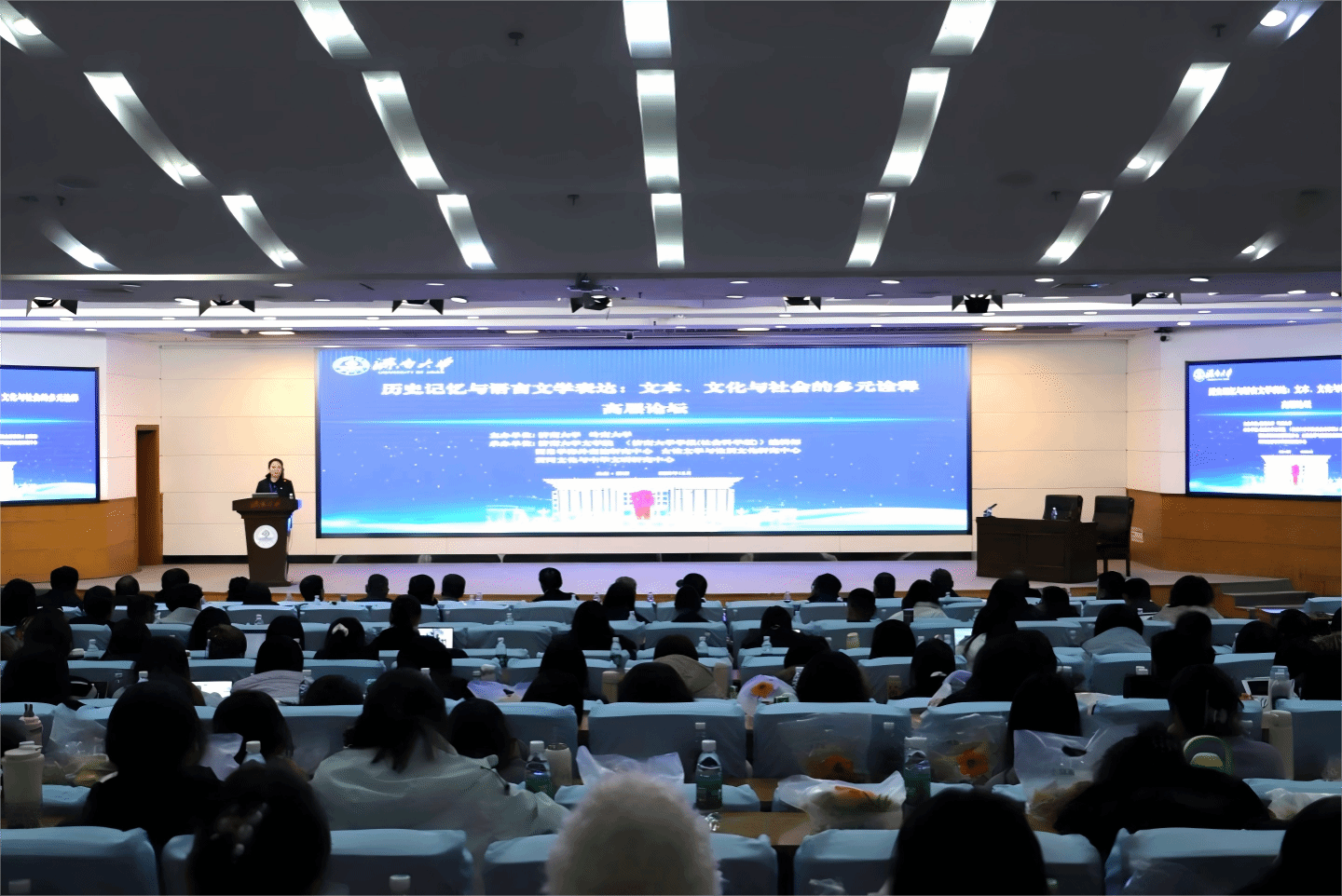 开幕式结束后,进入大会报告环节。大会报告共分两场。第一场有8位学者发言,中国人民大学的朱万曙教授追溯了包公故事的文化记忆演变;江苏第二师范学院的冯保善教授考论了冯梦龙对“私情”的崇尚及其民歌辑评;南京大学的孙书磊教授梳理了从古史辨到南戏研究的民间叙事传统;苏州大学的王宁教授则从艺术哲学角度追问“小青”形象的文学意义;中国艺术研究院李志远研究员探讨了傩戏文本与民间文化的关系;中国海洋大学的韦春喜教授从图画学视域分析了宋代题画咏史诗;山西师范大学的李奎教授考察了中国古典小说在马来西亚的在地叙事;安徽大学的周志雄教授则将目光投向网络文学,分析其对历史文明记忆的创新书写。