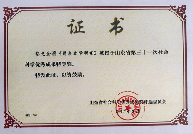 《简帛文学研究》省社科优秀成果特等奖证书