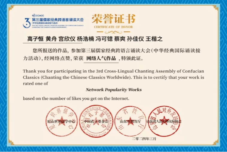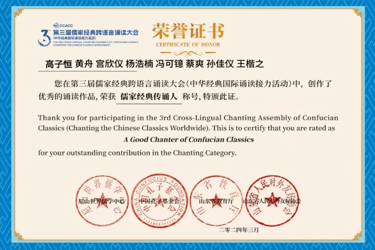 第三届儒家经典跨语言诵读大会荣获“铜奖”
